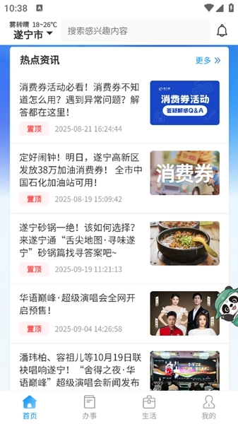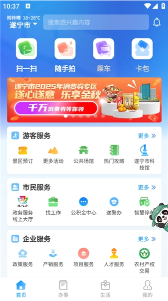 遂宁通是一款城市掌上平台软件,整合了政务与便民服务,借助数字化技术,市民无需出门就能在软件上办理各类事务。软件涵盖社保查询、医院挂号、业务办理等功能,用户可依据自身需求查找搜索对应功能,直接办理以提升办事效率。此外,平台还设有新闻资讯板块,能让你及时知晓本地的各类动态。