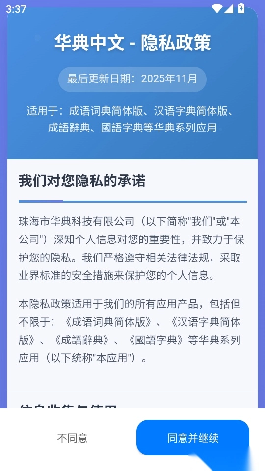 首先打开软件,阅读“隐私政策”条款内容,之后点击“同意并继续”按钮即可进入应用