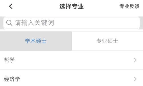 点击已选定的专业后,系统会跳转至专业选择列表页面,该列表涵盖了完整的学术型硕士与专业型硕士分类。若需要更改专业,只需在列表里直接选择新的专业就能完成调整。