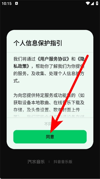 打开汽水音乐电视版后,当弹出个人信息保护指引的窗口时,点击同意按钮。