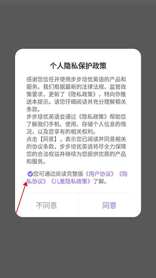 步步ABC使用指南 1、用户在使用步步ABC前,需先勾选个人隐私政策协议,方可继续使用。