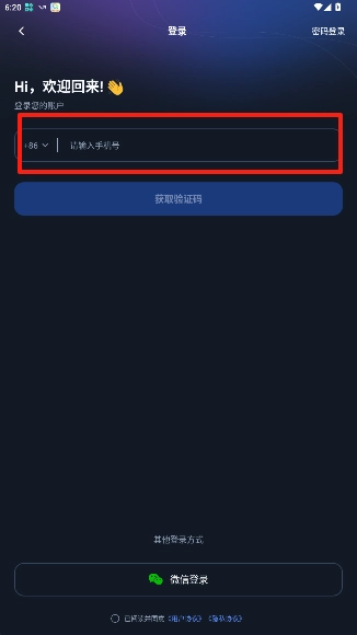 4、输入手机号码和你获得的验证码即可登录个人账号。