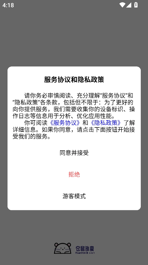 打开已安装完成的仓鼠外卖应用后,可依据页面上的提示点击“同意并接受”,或者选择以游客身份快速登录来体验平台提供的服务。