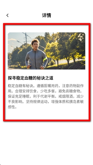 在详情页面里,你可以查看这篇文章的具体内容,从中学习与血糖管理相关的健康知识。