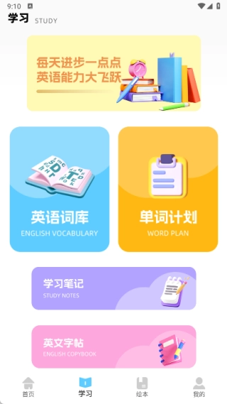 学习页面整合了英语词库、单词计划、学习笔记以及英文字帖等功能模块。