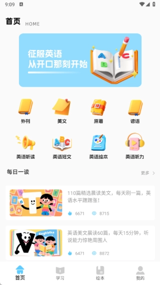 首页设有外刊、美文、原著、谚语、英语听读、英语短文、英语绘本及英语听力等内容板块,您也可以在此了解每日一读相关信息。