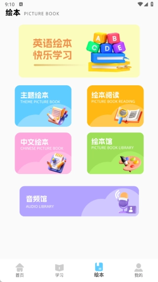 在绘本页面里,我们为您提供了主题绘本、绘本阅读、中文绘本、绘本馆以及音频馆等各类功能。