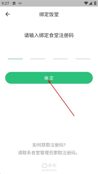 登录后进入饭堂绑定页面,输入食堂注册码并点击确定,即可完成饭堂绑定操作。