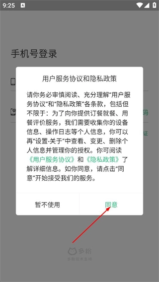 在应用弹出的用户服务协议窗口里,点击同意按钮后,就能进入手机号登录界面。