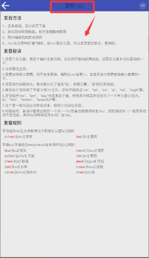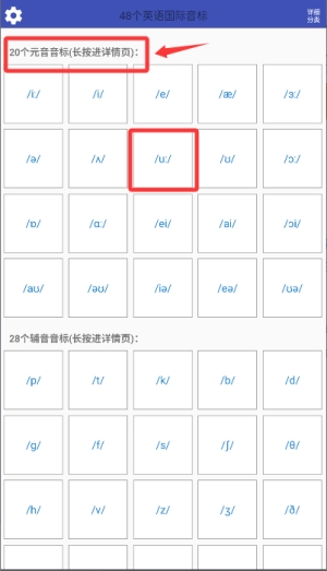 在元音区域找到指定音标进入详情页面。