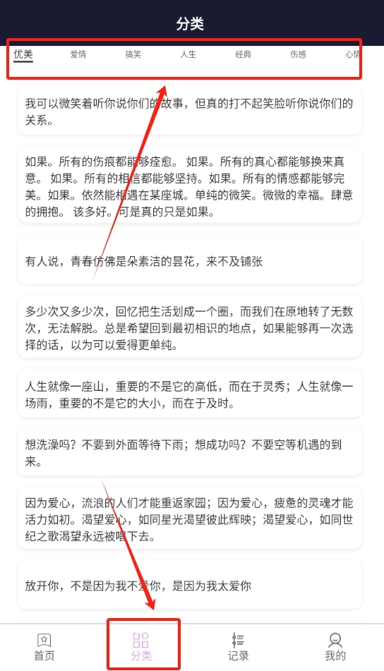 继续往下滑动页面,还能按照爱情、励志等不同分类来查找名言,不管想用哪种类型的,都能快速找到。
