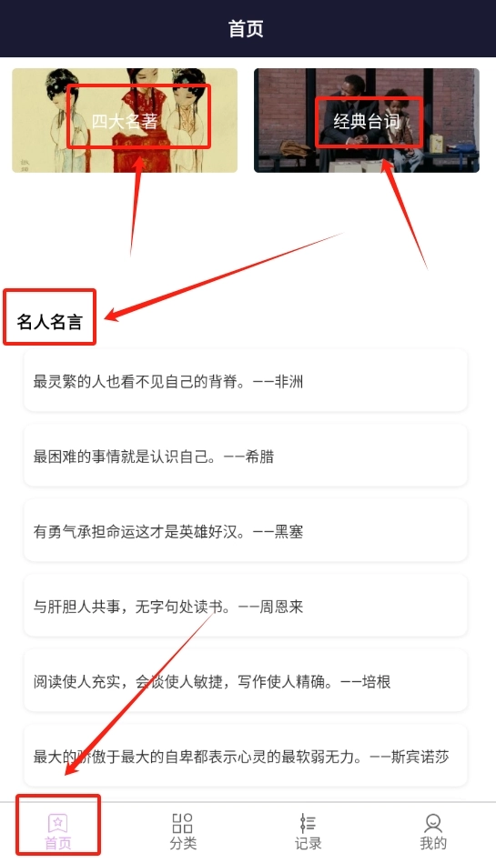 打开软件后,首页推荐的各类经典名言即刻映入眼帘,涵盖古今中外,随手翻阅便能有所收获。