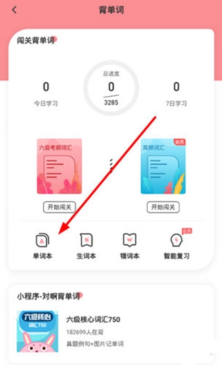 进入背单词界面后,你能在当前页面看到该词汇的学习入口,点击其中的“单词本”选项即可完成更换,具体操作可参考下图: