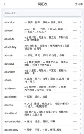 大家可以在词汇表中看到各类单词词汇,大家可以通过搜索或者点击单词首字母的方式来查找,具体操作方式如下图所示: