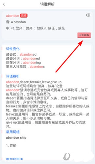 选择你需要的单词后,在词语解析里能查看该单词的具体介绍,点击“生词本”选项就能将其添加进去,操作示例见下图: