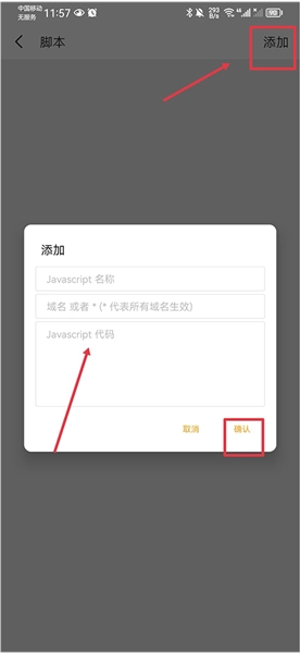 然后点击右上角的添加按钮,把脚本代码粘贴到对应的输入框里,最后点击确认按钮就可以了。