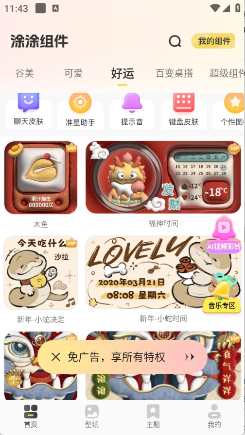 是不是受够了手机界面总是千篇一律?涂个组件能帮你美化手机桌面,这里有壁纸、组件还有灵动岛等资源,而且全部免费,每天都会及时更新新内容,让你的手机桌面更具特色,还能根据你的喜好智能推荐壁纸、主题和组件呢。