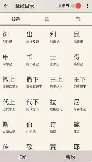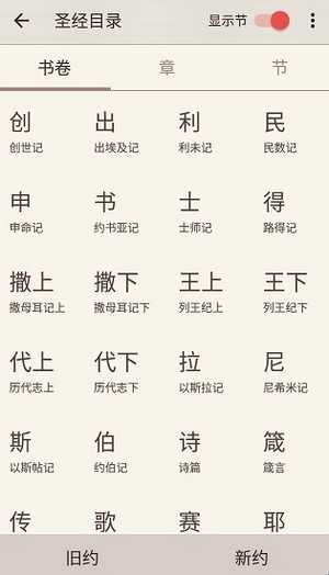 进入圣经经文界面后,轻触经文界面,屏幕上方会显示当前书卷名称和章数,右上角会显示当前版本。点击这个版本名称,也可以进入圣经译本选择界面。其余操作同上。