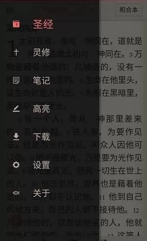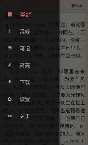 在首页左上角点击按钮,用户可以访问圣经、灵修、笔记和设置等功能。