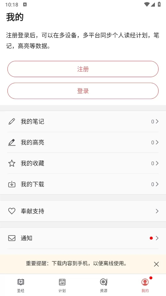 您可以免费注册“微读圣经”帐号,在云端储存您的个人数据(灵修笔记、高亮段落、读经计划进度等);还可以登录不同设备,同步个人数据。