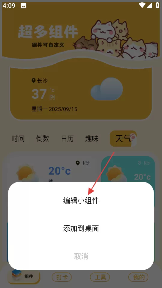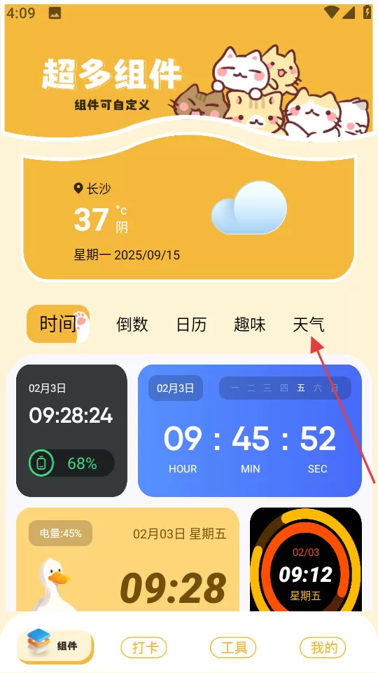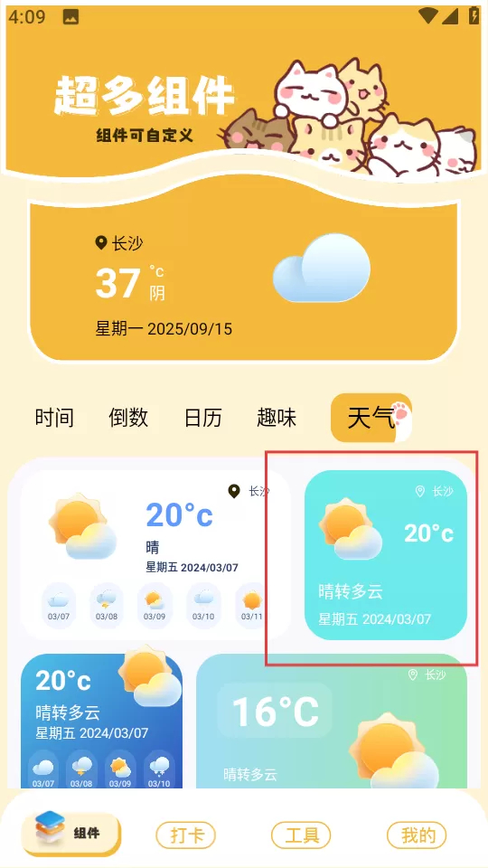 2、点击“天气”选项,即可看到多种样式的组件,挑选心仪的组件进入。