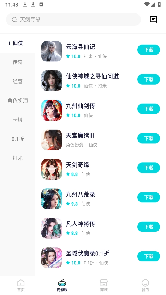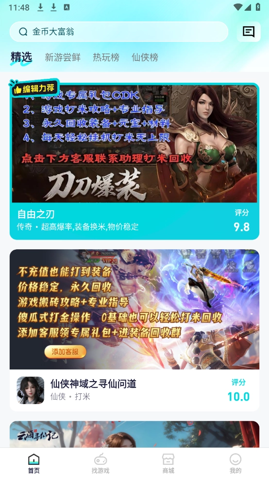 首页和找游戏页面上汇聚了海量游戏资源,仙侠、三国、传奇等各类游戏应有尽有。