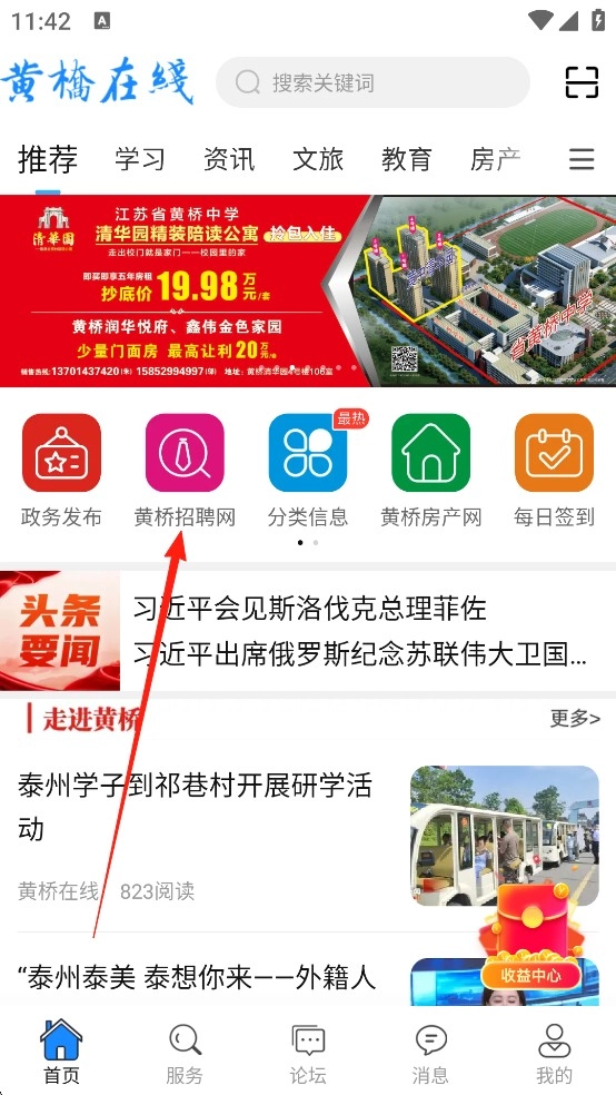 2、登录后返回 【首页】,在首页功能区找到并点击【黄桥招聘网】入口,即可浏览黄桥本地最新招聘信息。