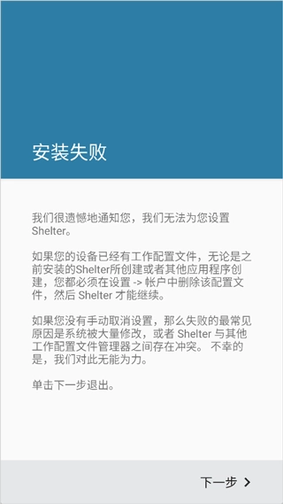 若用户手机已存在工作配置文件,需先进入手机设置的帐户选项中删除该工作配置文件,Shelter才能正常运行,否则会出现失败提示。