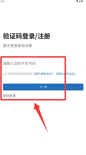 2、在登录页面输入手机号,勾选同意服务条款后进入下一步。