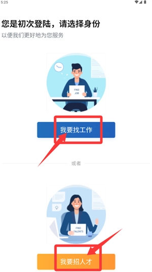 3、首次使用需选择求职或招聘身份,根据需求进行勾选。