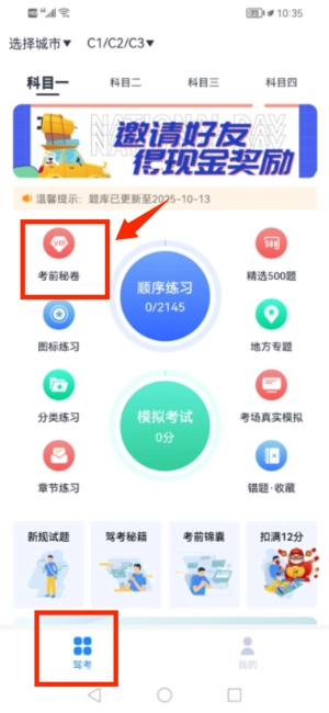 3、进入驾考页面选择考前秘卷功能开始练习。