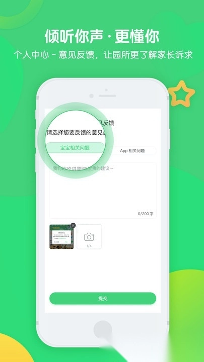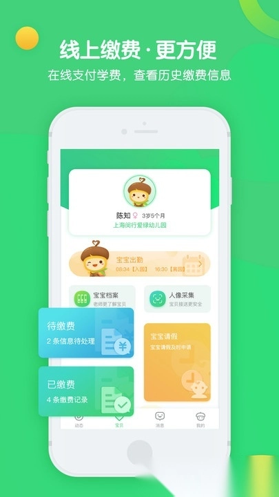 实时知晓宝宝在园的动态;及时获取幼儿园的新闻与通知;线上缴费更加便捷;通过专属反馈渠道倾听家长需求;一端操作让家长更感轻松。