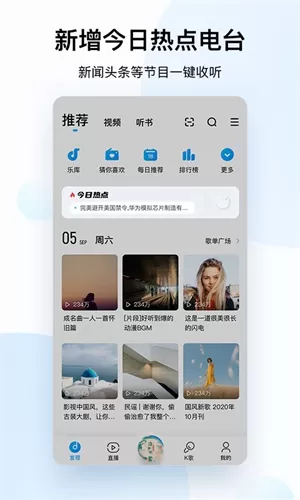 1、为听众提供在线听歌服务,听众可在此挑选心仪的音乐即时聆听,尽情享受听歌的乐趣。