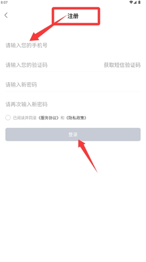 2、在注册页面填写手机号及验证码,设置登录密码并确认提交。