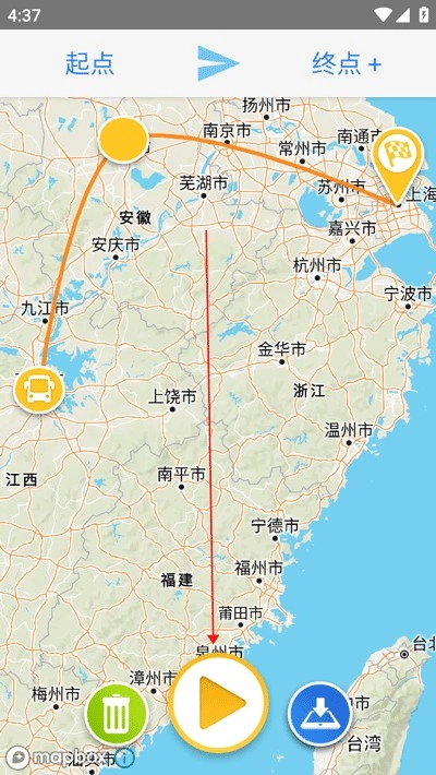 在设置好途经点和选择好交通工具后,点击界面中间的播放按钮,就能预览轨迹视频了。