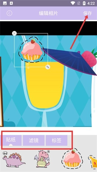 在【编辑相片】页面,可通过【贴纸】【滤镜】【标签】功能对图片进行装饰,编辑完毕后点击右上角的【保存】按钮即可。