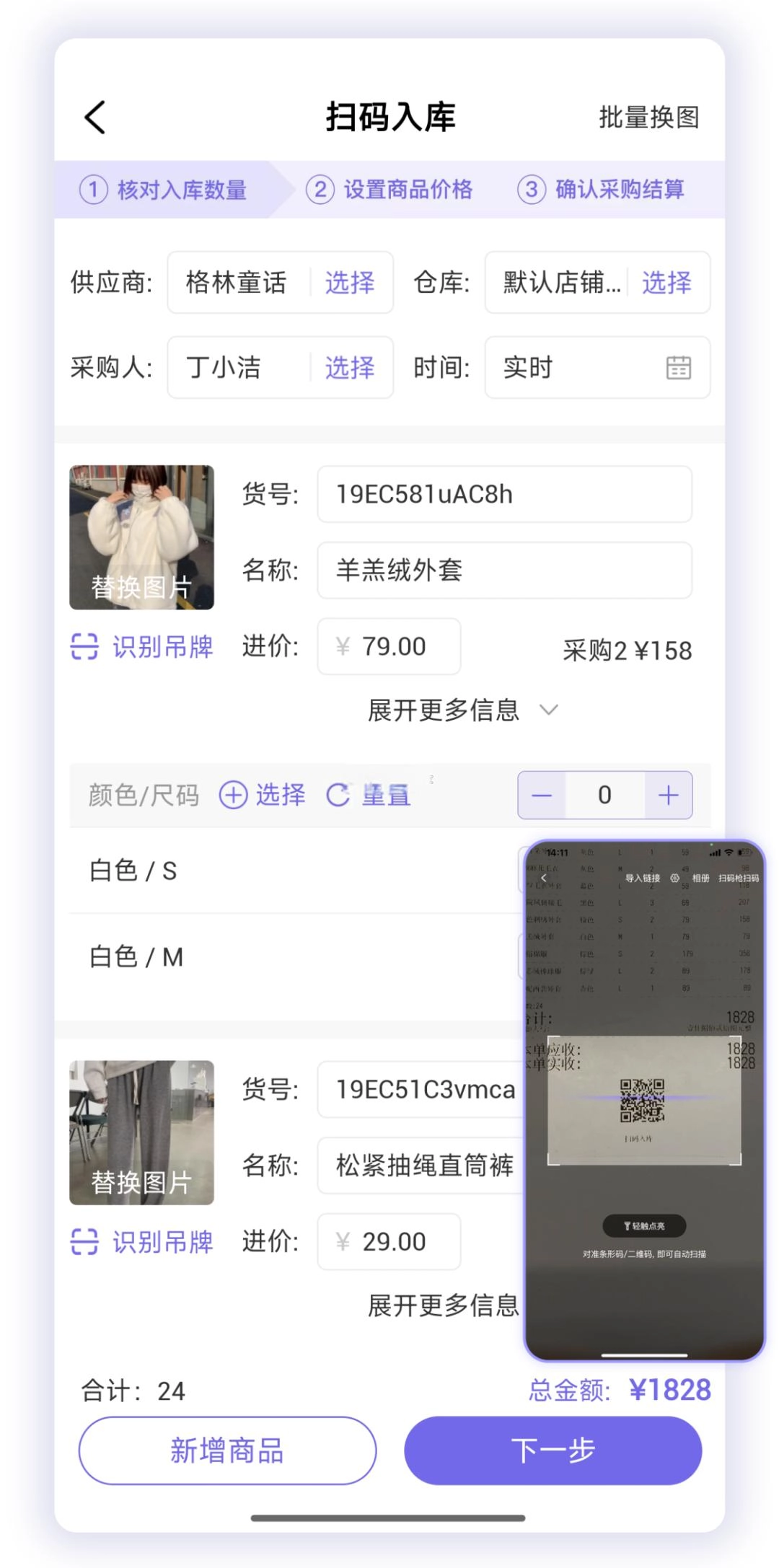 通过扫描商品条码,系统可自动同步颜色、尺码与价格信息,从而达成商品的快速入库操作。