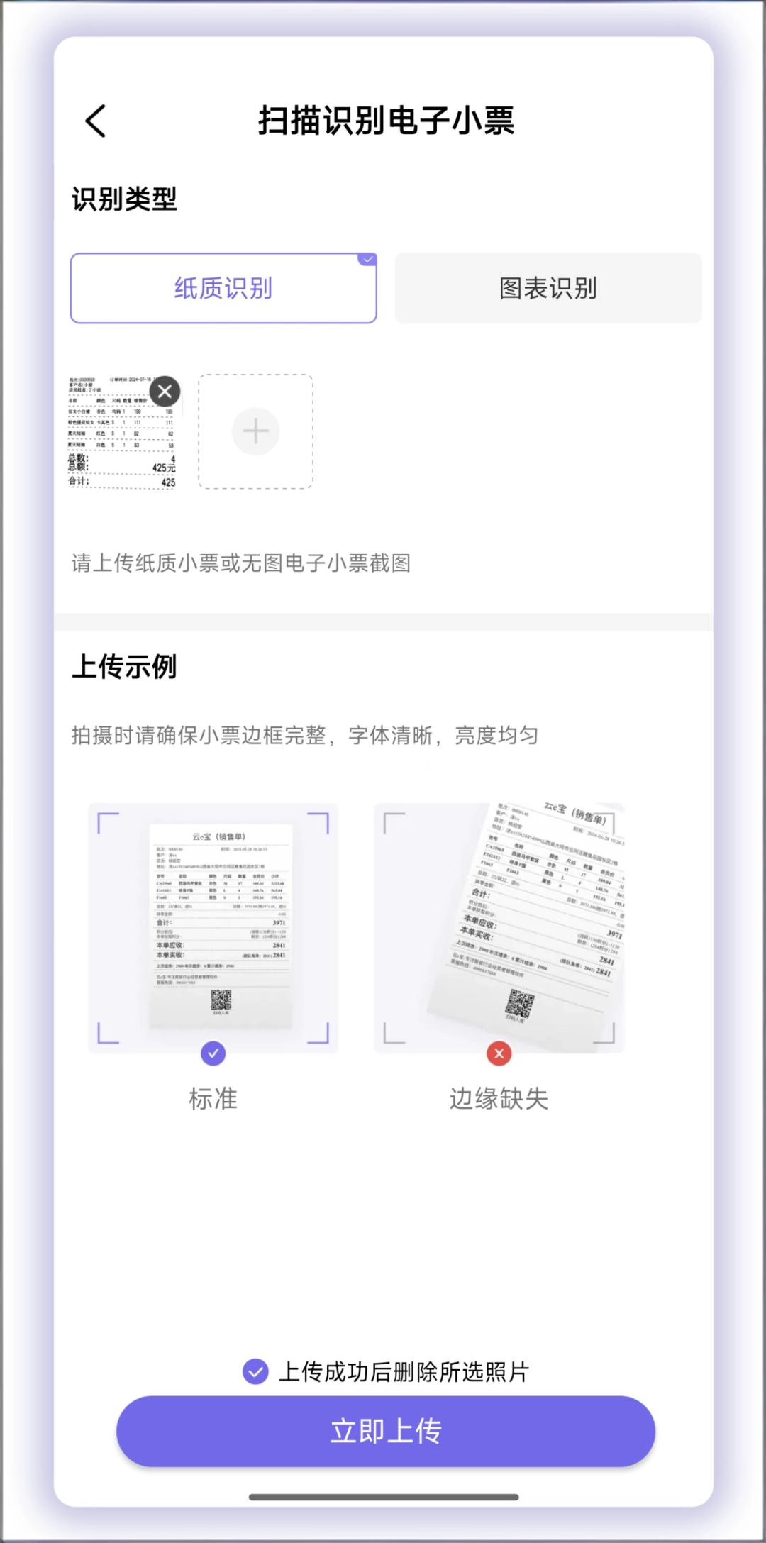 可以支持拍摄纸质小票,也可以上传电子小票的截图,系统会通过智能识别来自动完成录入操作。