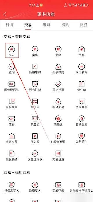 3、在展开的功能菜单中,选择“买入”功能项,点击后系统将跳转至交易界面,在此可执行具体的委托下单操作。