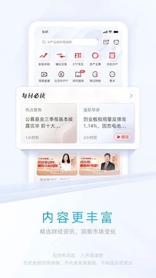 2、与中信证券丰富的投研资源深度绑定,能够优先获取由公司内部出品的前沿市场分析、行业解读与个股研究报告。这些内容具有较高的参考价值,是平台的特色信息源。
