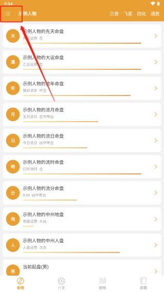 回到首页就能查看紫微斗数排盘,支持三合、飞星、四化、通胜等多种命理体系的解析。