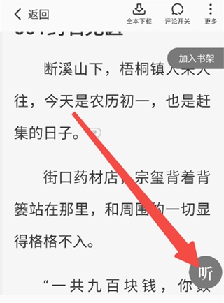 呼出阅读菜单后,点击右下方的【听】按钮就能开启听书功能。