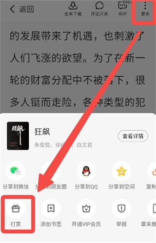 方法一:在阅读页面点击【更多】选项,接着选择【打赏】功能,然后挑选你想要赠送的打赏礼物,最后完成相关操作即可。