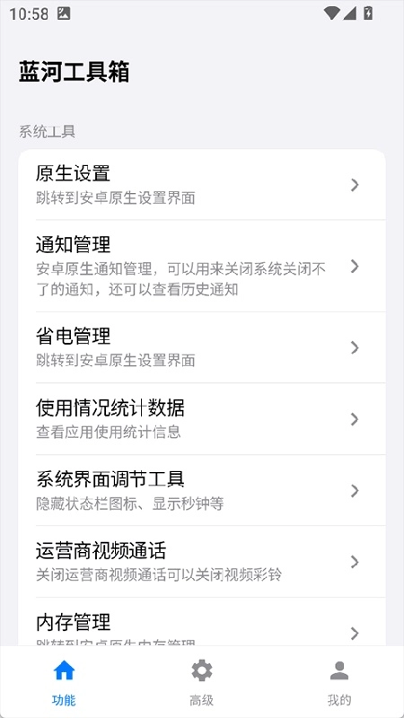 蓝河工具箱免费版能帮助你快速完成各项调整,让系统栏始终保持整洁清爽,有效延长手机续航时间,还能满足更多个性化设置与需求。