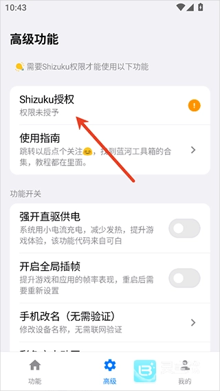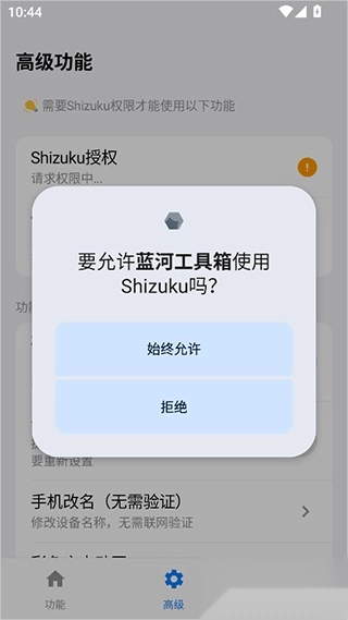 激活的方法很简单:先在本站安装Shizuku,接着按照它的教程完成Shizuku的激活,之后就能在蓝河工具箱里进行授权操作了。