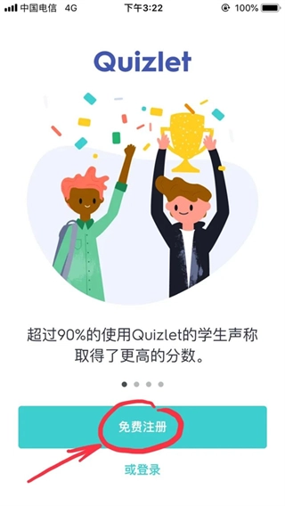 安装完成后,从桌面启动Quizlet,接着点击“免费注册”按钮。