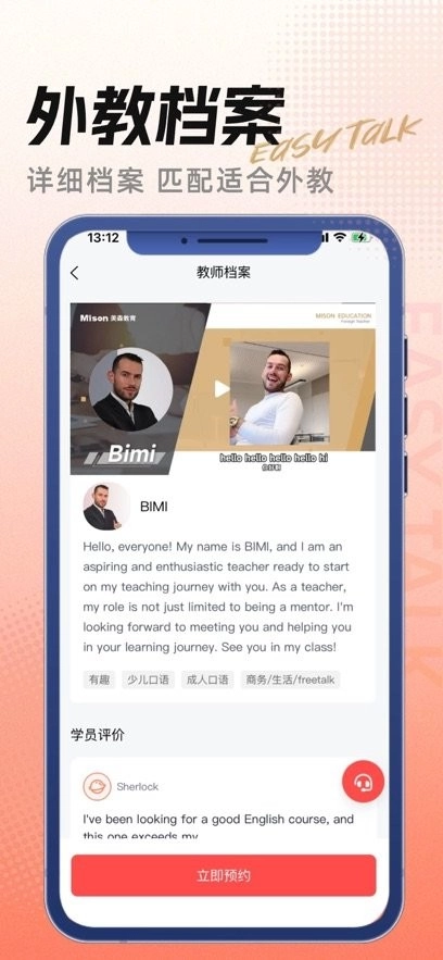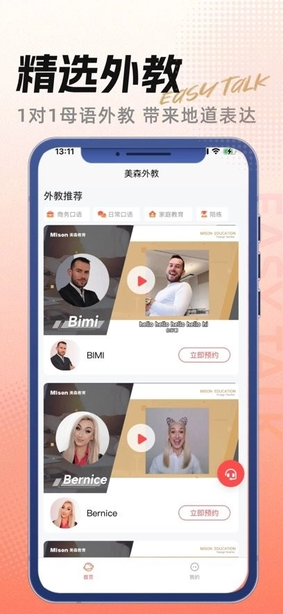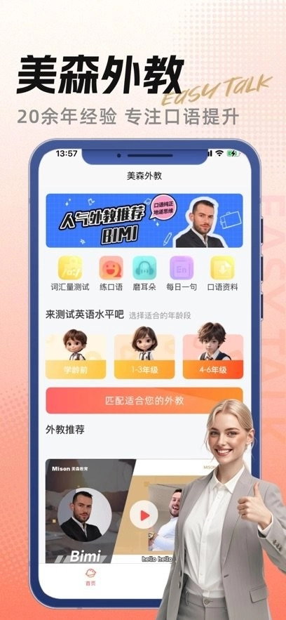 美森外教隶属于美森教育,是专注于真人外教1对1教学的产品,整合了菲教与1对1欧美外教资源,打造能全面提升口语能力的内容和课程体系。它助力学习者轻松开口表达,实现“EasyTalk想说就说”的学习体验,致力于为有英语、日语提升需求的学习者,提供多维度、高效率的口语提升方案。
