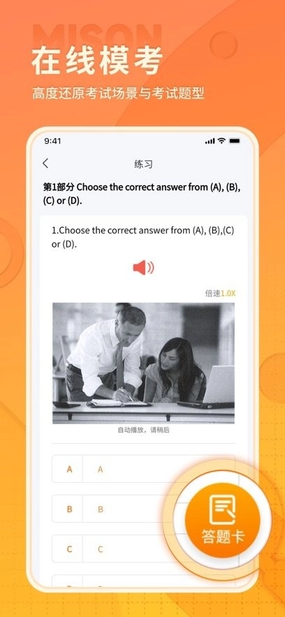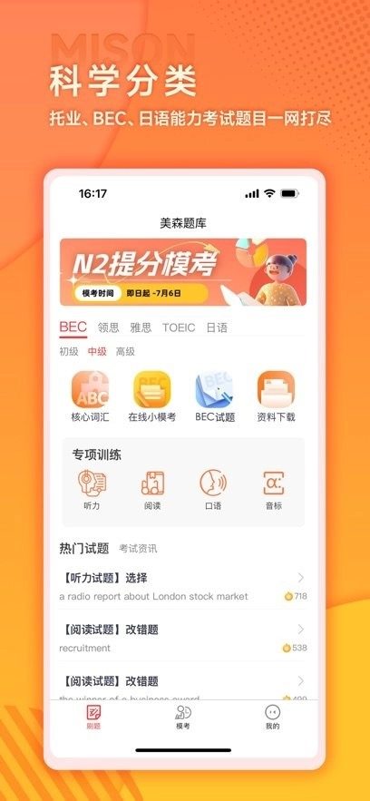 美森题库是美森教育自主研发的刷题助学工具,覆盖BEC商务英语、托业、领思、雅思、日语能力考等多种商务及语言类考试的题库资源。平台整合了海量精选试卷与习题,结合美森教育自研的专业内容,针对考试重点进行深度解析,助力学习者突破难点,并提供个性化的学习建议与规划。其核心目标是为有英语、日语考试提升需求的学习者,打造多维度的高效提升方案。