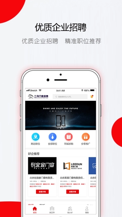 二马门窗平台是佛山尔玛依娜人才服务有限公司旗下的在线人才服务平台,尔玛依娜门窗平台则是该平台为客户开发的软件产品。为优化离线服务体验,该应用主要提供服务咨询与工作推荐功能,旨在为门窗行业的人才与企业打造人才供需匹配的软件产品。此外,为适配门窗行业的设备使用及交易需求,实现线下全新或二手设备的交易,我们也计划在平台内开展线上商品购买业务。尔玛依娜门窗人才专注于互联网门窗行业的招聘与求职应用,能让求职者与招聘方快速精准地完成匹配与信息查看,双方可随时随地直接沟通。平台聚焦互联网领域,用户每日可在线浏览并选择海量工作机会,在这里,换工作、升职加薪都能变得简单便捷。