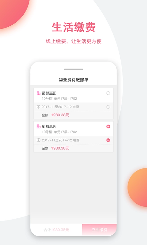 水费、电费、燃气费、物业费,在线缴纳。